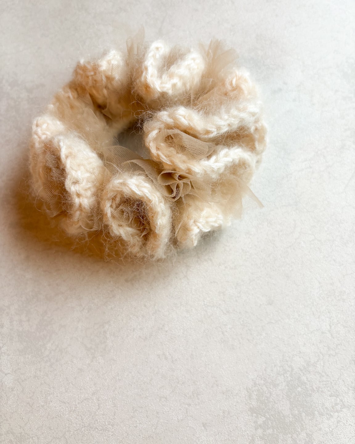 チュールと毛糸がmixされたオリジナルデザインのシュシュになっております。