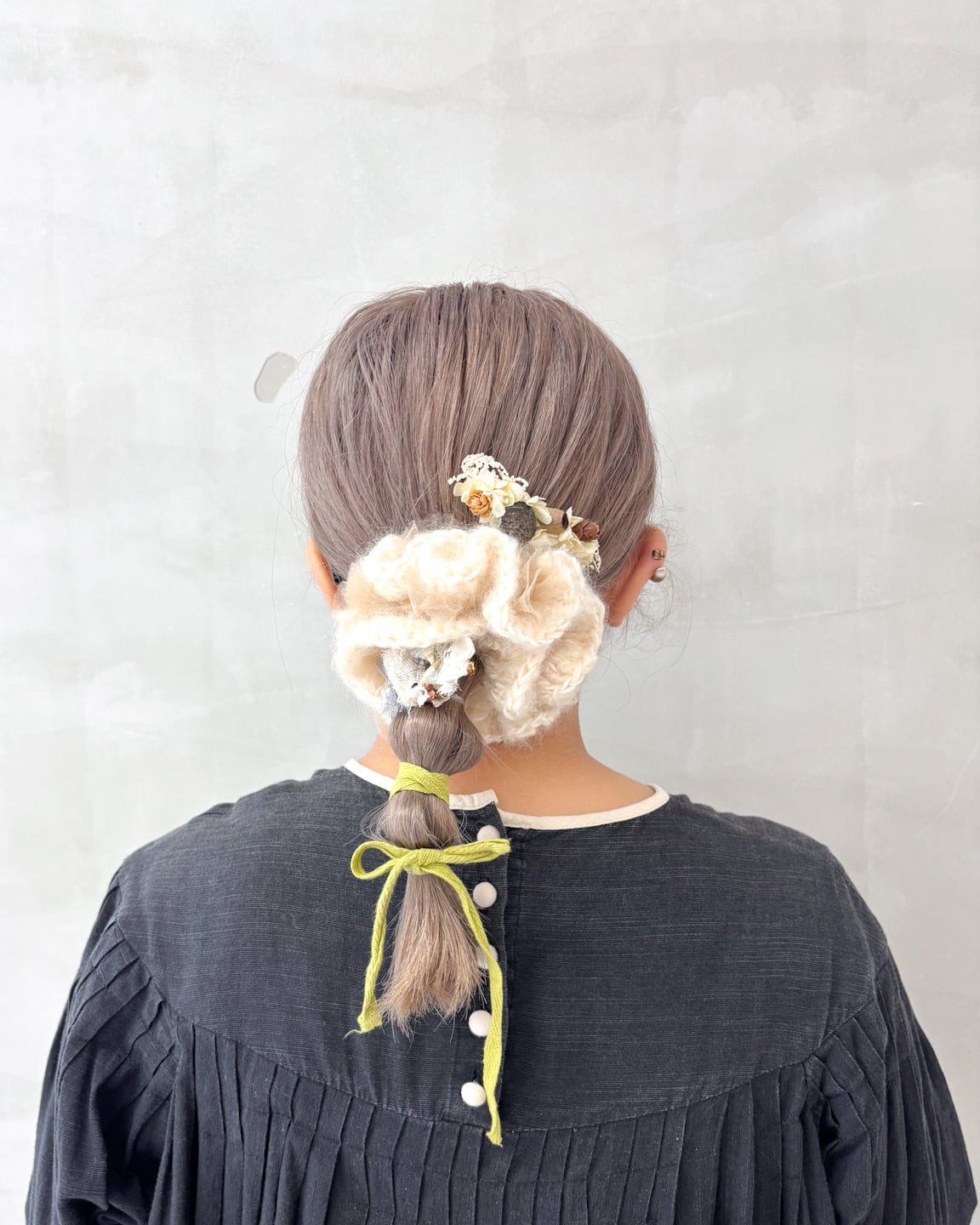 手首につけてもヘアアレンジにも使いやすいシュシュです。